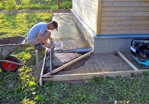 - Залив бетон, выравнивают его поверхность по рейкам. Для увеличения прочности и влагостойкости покрытия применяют железнение. Бетонную отмостку несколько раз присыпают сухим цементом и заглаживают железным мастерком. После этого конструкцию накрывают тканью, которую периодически смачивают водой. В течении недели ткань должна быть постоянно влажной. Такой подход дает возможность избежать высыхания бетона, пока он не набрал твердость.